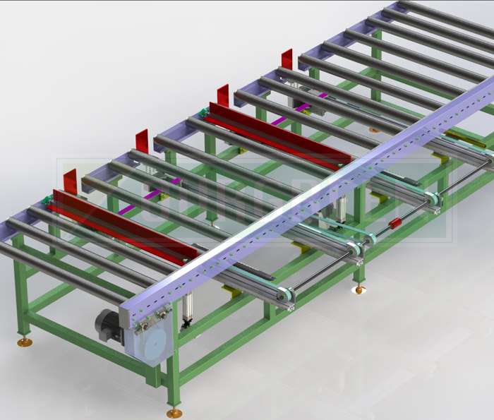 南京歐格設(shè)計(jì)制造的機(jī)械推手將板材推入碼垛堆疊,堆疊成包裝要求高度,輸出打包。
